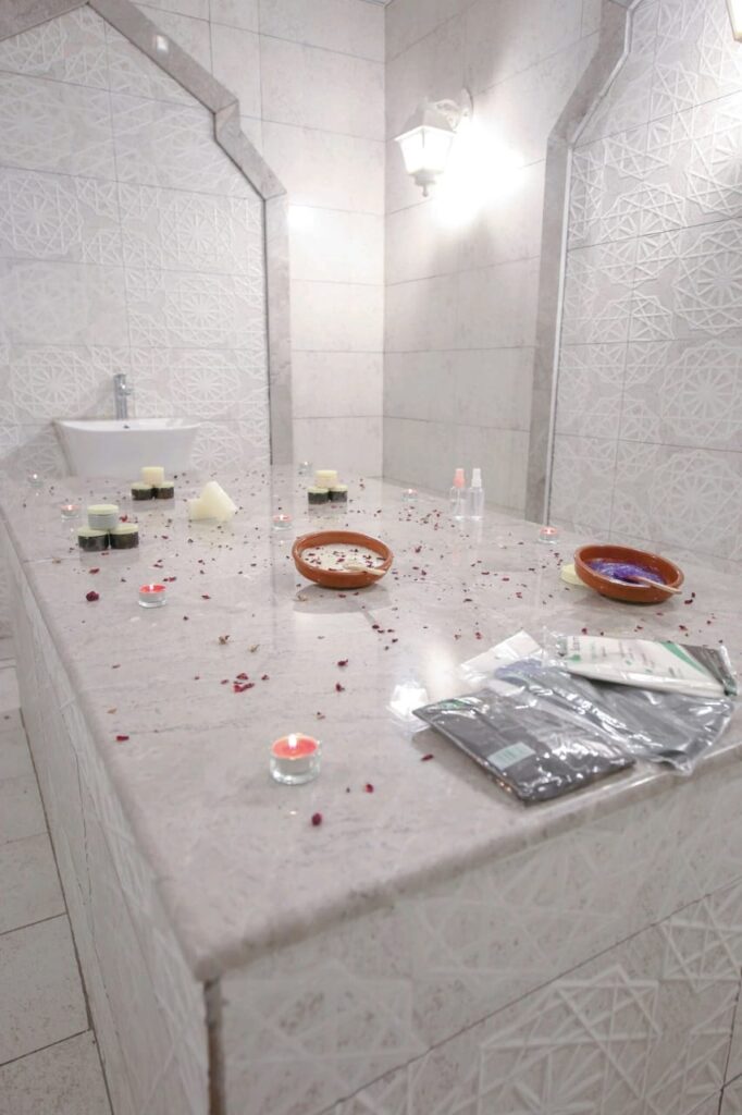 تقشير عميق لخلايا الجلد الميت لكامل الجسم في حمام البخار باستخدام الصابون البلدي والليفة المغربية والتي تساعد على التخلص من الأوساخ والدهون المتراكمة في مسامات الجلد لتعيد له النظارة والحيوية .
